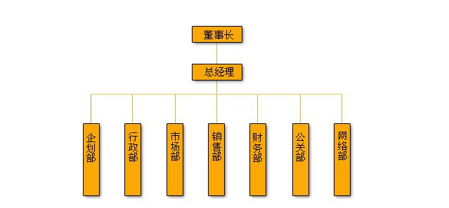 | 董事長:領(lǐng)導(dǎo)公司方向與策略。 總經(jīng)理:負責(zé)公司全部事宜 行政部:配合總經(jīng)理的工作安排 市場部:完成市場調(diào)研,并作出相應(yīng)應(yīng)對措施 銷售部:負責(zé)市場開發(fā)及銷售公司產(chǎn)品 財務(wù)部:負責(zé)公司的財政 公關(guān)部:負責(zé)接待 網(wǎng)絡(luò)部:負責(zé)公司官網(wǎng)及推廣 |